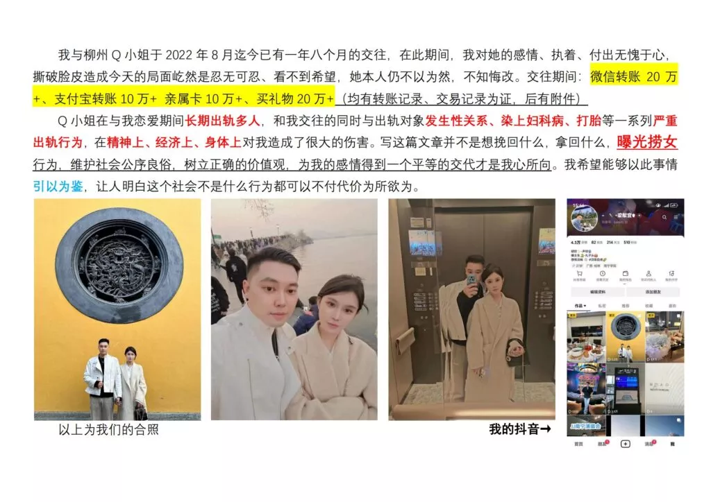 柳州的顶级海后Q小姐覃海美,长期以来对其富二代男友进行Cao控,成功骗取金钱高达60万元。在此期间,她不仅利用男友的财富,频繁与多名男性保持不正当关系,还因此感染了性病,并进行了打胎。然而,她并没有停止对男友的Cao控,直到男友最终觉醒,意识到她的不堪,痛心疾首地撰写了一份长达55页的PPT,以曝光其渣女行径。