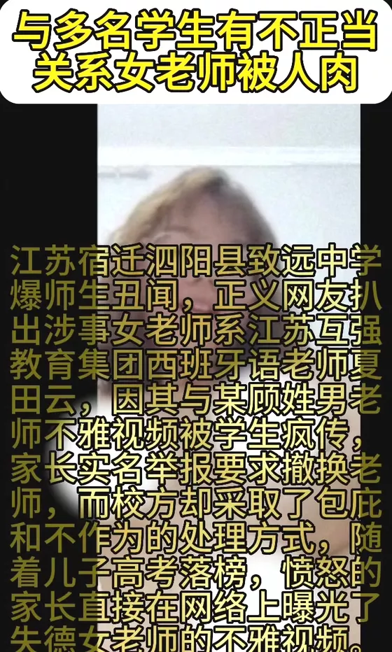 江苏宿迁泗阳县致远中学爆出师生丑闻。江苏卓越日语专修学院的西班牙语老师夏田云因与校领导发生不正当关系,遭到其男友顾某的曝光。此外,她还曾与班上的男生保持不当关系,实属令人震惊的行为。此事件引发社会广泛关注,许多学生对该教师的行为表示强烈不满。